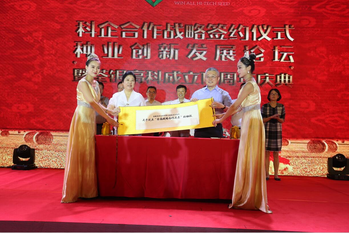 十五載風雨兼程,十五載春華秋實!2017年8月29日,科企合作戰略簽約儀式·種業創新發展論壇暨荃銀高科成立15周年慶典大會在合肥隆重舉行。農業部種子局局長張延秋,農業部科教司司長廖西元,中國科學院院士、國家基因研究中心主任、上海植生生態所所長韓斌,中國種子協會副會長兼秘書長蔣協新,安徽省科技廳廳長宛曉春,安徽省農業委員會副主任周世其、朱永東,“中國種業十大功勛人物”、荃銀高科創始人、安徽張海銀基金會理事長張海銀先生,以及來自農業部、中國種子協會和省、市有關部門的領導、專家、嘉賓,國家水稻商業化分子育種技術創新聯盟的科學家,戰略合作簽協單位代表,種業界同仁,還有來自印度尼西亞、孟加拉、巴基斯坦、越南等國家的20多位外賓朋友,計500多人參加了此次活動。